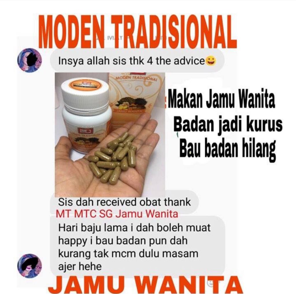 JAMU WANITA MODEN TRADISIONAL 60 biji rm56 300mg FUNGSI2NYA. Selain jamu tradisional gendong sekarang banyak kok jamu tradisional lain yang dikemas jadi lebih modern misalnya saja jenis jamu tradisional Madura. Bagian-bagian itu antara lain ada rimpang atau akar-akaran daun-daunan kulit batang hingga buah.